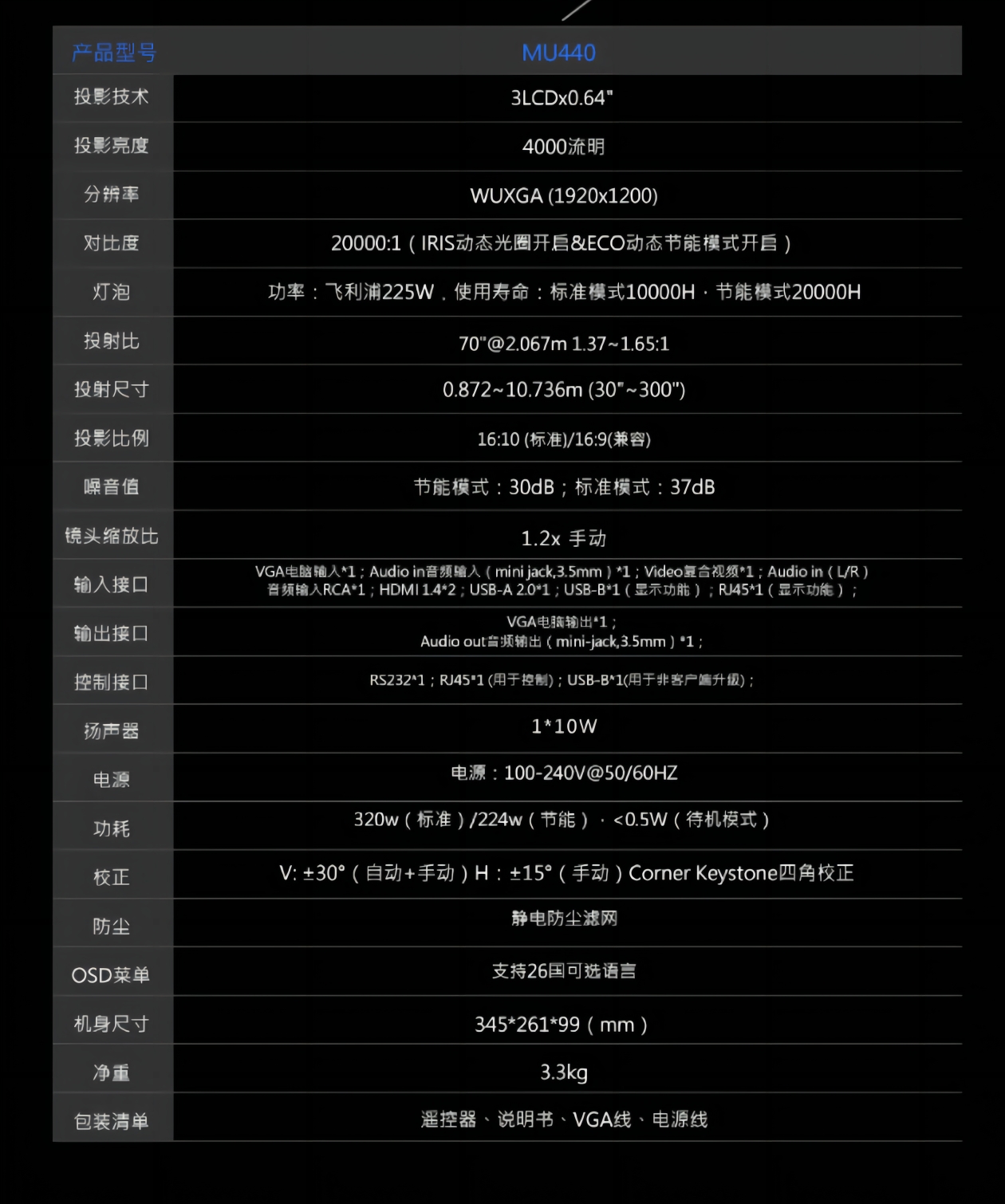 幕布尺寸  :   100英寸